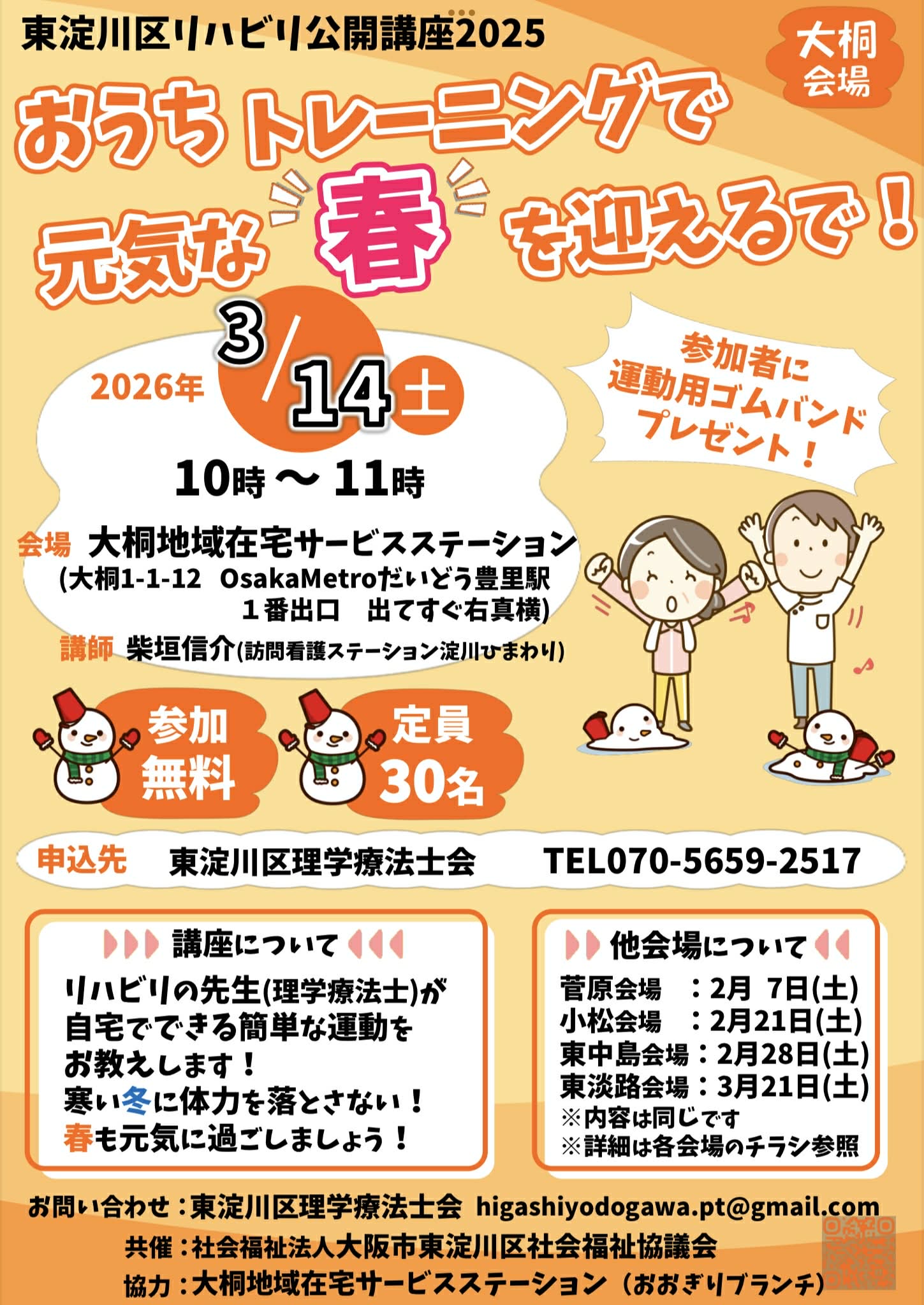 お知らせ 2026.02.01 2026.02.01 東淀川区リハビリ公開講座(大桐会場) 東淀川区リハビリ公開講座(大桐会場) 大桐地域在宅サービスステーション(おおぎりブランチ)にて、東淀川区リハビリ公開講座を開催致します♪ ↓詳細は、下記画像をクリックしてください↓